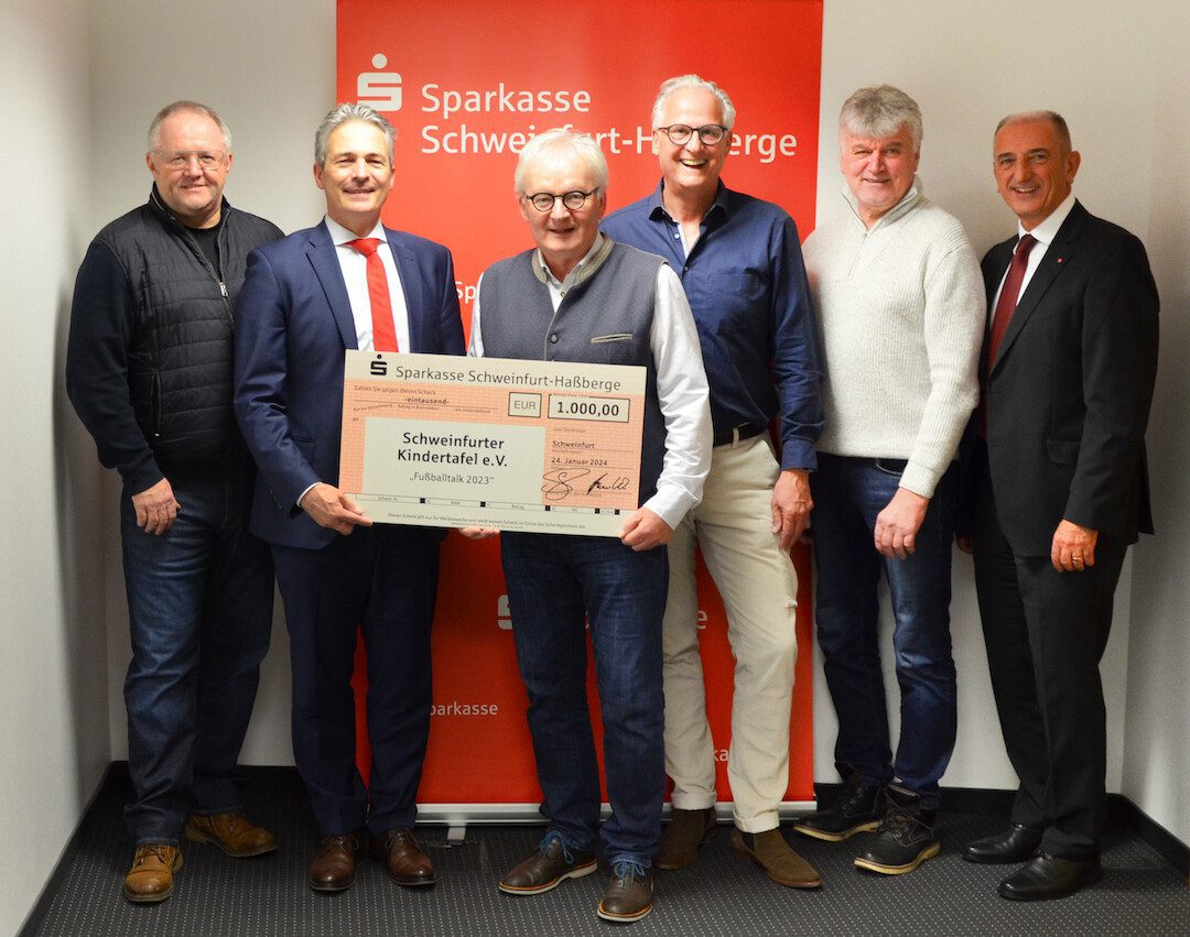 Schweinfurt – Einmal mehr haben die 1. Fußballschule Schweinfurt und die Sparkasse Schweinfurt-Haßberge ihr soziales Engagement unterstrichen. Beim „Fußballtalk 2023“ im Sparkassen-Veranstaltungszentrum wurden im Rahmen eines Gewinnspiels Spenden gesammelt und von Fußballschule und Sparkasse gemeinsam auf 1.000 Euro aufgestockt.