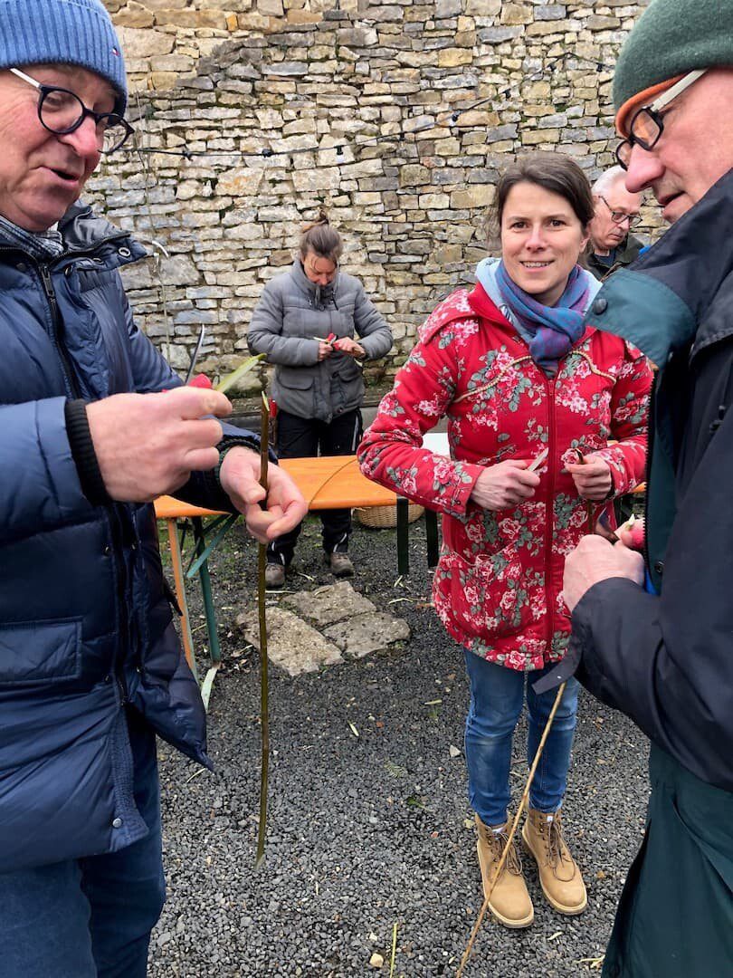 Christoph Fallenbacher, zertifizierter Obstbaumpfleger, schulte in einem kurzen Vortrag die Teilnehmer mit den theoretischen Grundkenntnissen des Veredelns. Es ging um die Kopulation, das heißt. die Verbindung eines einjährigen Obsttriebes mit einer Pflanzenunterlage. Hierbei müssen zwei fast gleich große Triebe miteinander verbunden werden. Die schrägen Schnittstellen werden aufeinandergelegt, umwickelt und nach außen mit Wachs verschlossen.Dass diese Kunst erst erlernt und geübt werden muss, erfuhren die Teilnehmer bei den Übungen in der Praxis. An jungen Weidenruten hatte jeder Obstbaumliebhaber die Möglichkeit seine Schnitttechnik zu verfeinern, bevor es an die Veredelung der jungen Obstbäume ging. Es bestand für jeden Teilnehmer die Möglichkeit eigene Obstreiser seiner Lieblingssorte mitzubringen und diese auf eine geeignete Unterlage, die die Wüchsigkeit des Baums bestimmt, zu veredeln.