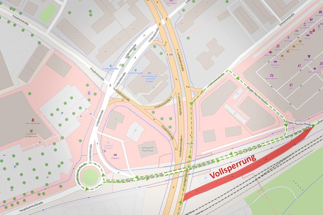 Schweinfurt – Aufgrund von Arbeiten an Versorgungsleitungen im Bereich der Landwehr- und Gunnar-Wester-Straße ist eine Umleitung des Verkehrs aufgrund einer Vollsperrung der Abzweigung der Ernst-Sachs-Straße (B286) Richtung Stadtmitte vom 31.05. bis voraussichtlich 14.06. erforderlich.
