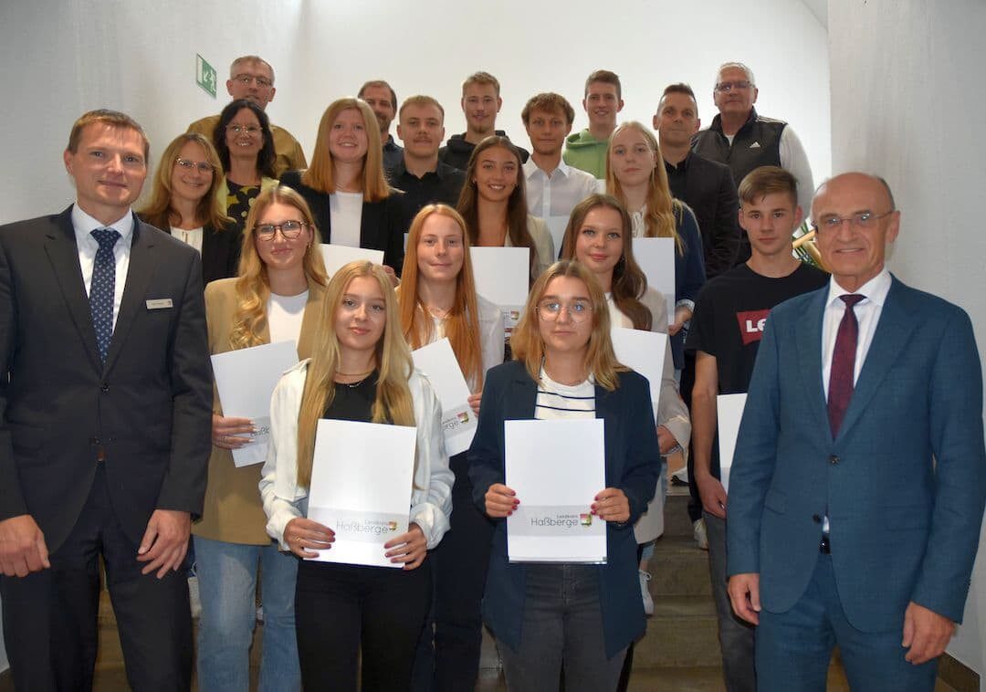 Haßberge – Strahlende Gesichter am Landratsamt Haßberge: Nach dreijähriger Ausbildungszeit haben alle Auszubildenden des Ausbildungsjahres 2021/2024 ihre Abschlussprüfung bestanden. „Das ist heute ein Meilenstein in ihrem beruflichen und privaten Leben“, gratulierte Landrat Wilhelm Schneider und freute sich über die Ergebnisse.