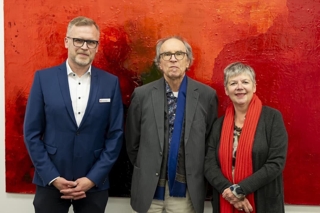 Das Foto (© Thomas Stadler) zeigt von links nach rechts: Thomas Engert (Sparkasse), Künstler Joachim Kersten, Kuratorin Andrea Brandl
