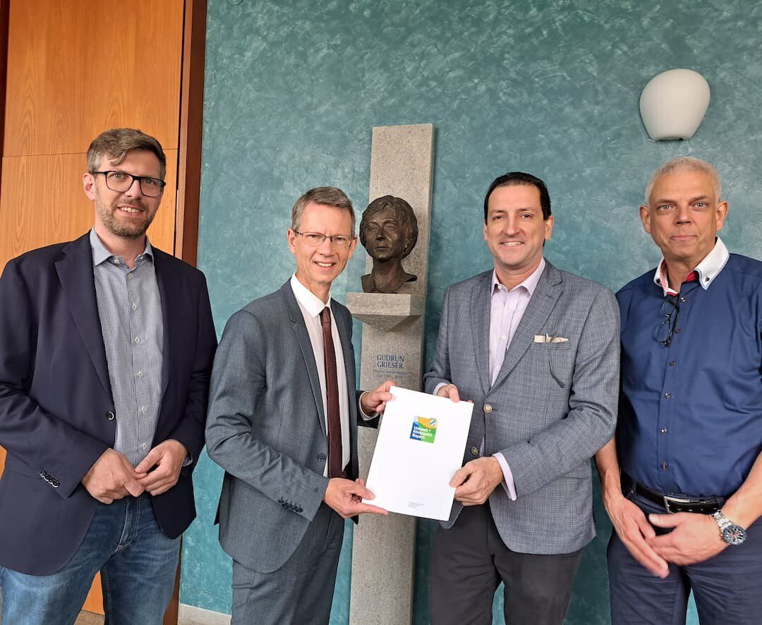 Schweinfurt – Oberbürgermeister Sebastian Remelé überreichte gemeinsam mit dem städtischen Umweltreferenten Jan von Lackum der Bosch Rexroth AG eine Urkunde über die erfolgreiche Teilnahme am Umwelt- und Klimapakt Bayern. Der Bayerische Staatsminister für Umwelt und Verbraucherschutz, Thorsten Glauber, verlieh dem Unternehmen diese Auszeichnung für die Verpflichtung zu einer qualifizierten freiwilligen Umweltleistung, die weit über die rechtlichen Vorgaben hinausgeht. Seit 2007 nimmt Bosch Rexroth am Umwelt- und Klimapakt teil. Nun erfolgte die 7 Verlängerung mit einer Laufzeit bis 2027.