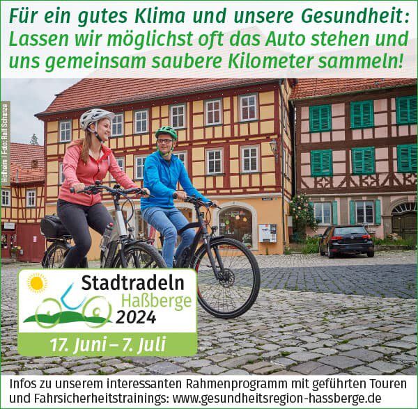 Haßberge – Auch im Jahr 2024 wird der Landkreis Haßberge an der deutschlandweiten Kampagne STADTRADELN teilnehmen. Der diesjährige regionale Zeitraum wird von 17.06 – 07.07.2024 sein. Anmelden können sich Interessierte schon jetzt unter https://www.stadtradeln.de/landkreis-hassberge.