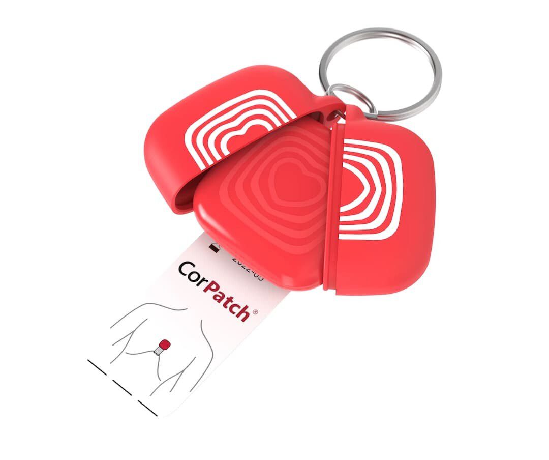 · Der „CorPatch“-Sensor ist eine kleine, quadratische Kunststoffbox von der Größe einer Streichholzschachtel. Im Notfall wird sie auf dem Brustkorb eines Betroffenen angebracht.