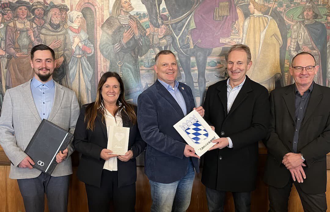 Der Erste Bürgermeister von Kolitzheim, Horst Herbert, überreichte nun ganz offiziell das Standesamt-Schild an seinen Kollegen, den Ersten Bürgermeister von Volkach und VGem-Vorsitzenden, Heiko Bäuerlein und freute sich mit ihm über diese weitere gelungene interkommunale Zusammenarbeit. Erster Bürgermeister Heiko Bäuerlein dankte seinerseits der Leiterin des Volkacher Standesamtes, Margit Krämer, und dem Standesbeamten Martin Müller, für die Bereitschaft die zusätzlichen Aufgaben aus Kolitzheim zu übernehmen: „Das Standesamt ist ein ständiger Begleiter auf allen Lebenswegen. Unser Team ist gerne für Sie da.“