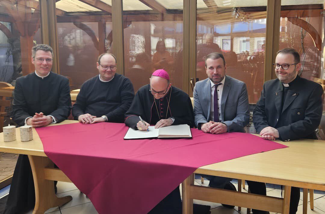 Im Rahmen eines gemeinsamen Mittagessens konnte Stefan Rottmann Bischof Dr. Franz Jung in Schonungen willkommen heißen. Unter den Augen von Pfarrer Dr. Eugen Daigeler, Pfarrer Kai Söder, Diakon Frank Menig und Bürgermeister Stefan Rottmann wurde auch ein feierlicher Eintrag mit persönlicher Widmung ins Goldene Buch Schonungens vorgenommen.
