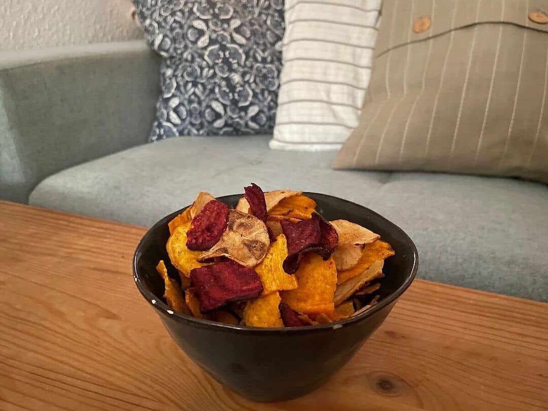 Schon gewusst? – Gemüsechips werden als Alternative zu Kartoffelchips immer beliebter. Um sie herzustellen, werden dünne Scheiben von Süßkartoffeln, Roter Bete, Möhren, Pastinaken oder anderem Gemüse in Pflanzenöl frittiert.