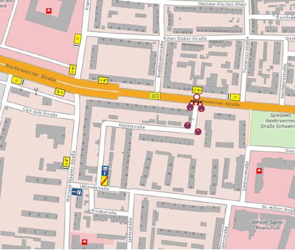 Für die Bauarbeiten sind Änderungen in der Verkehrsführung erforderlich. In der Niederwerrner Straße ist eine wechselseitige Teilsperrung im Straßenbereich notwendig. Die bestehenden öffentlichen Parkmöglichkeiten sind für den Zeitraum der Maßnahme eingeschränkt. Eine Befahrung der Niederwerrner Straße sowie die Nutzung des Geh- und Radwegs bleibt aber zu jeder Zeit in beide Richtungen gewährleistet. Der Ausfahrtbereich der Kleiststraße auf die Niederwerrner Straße wird vorübergehend gesperrt. Dadurch erfolgt in der Kleiststraße eine Sackgassenregelung.