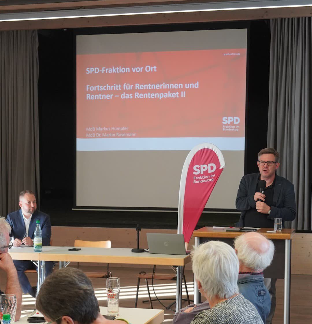 Referent Dr. Martin Rosemann, der Sprecher für Arbeit und Soziales der SPD-Fraktion im Deutschen Bundestag kam auf Einladung des Schweinfurter SPD-Abgeordneten Markus Hümpfer nach Schweinfurt. In seinem Vortrag stellte Rosemann die zentralen Elemente des Rentenpakets II vor.