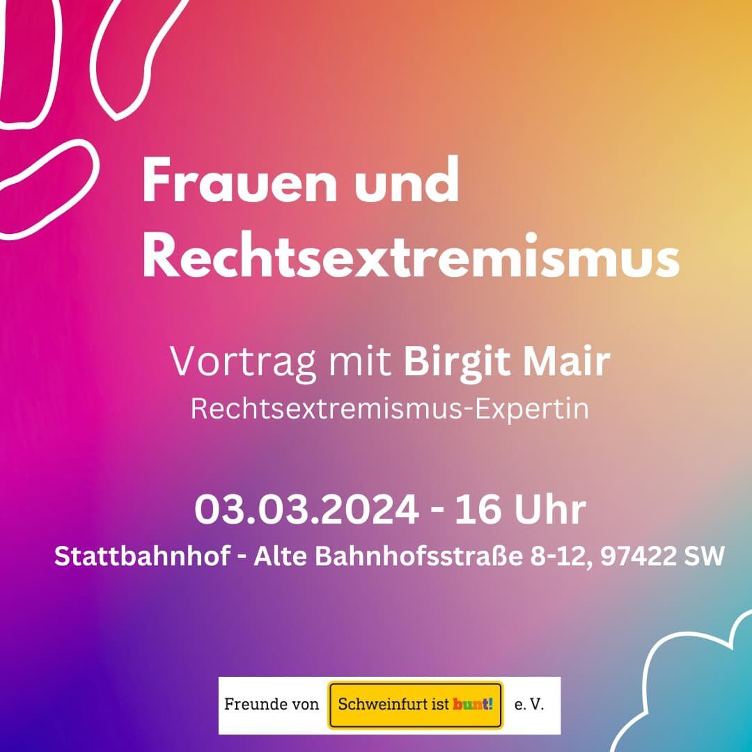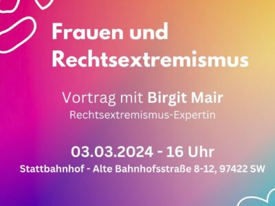 Im Rahmen der 32. Schweinfurter Frauenwochen möchte Schweinfurt ist bunt gemeinsam mit Brigit Mair diesen Fragen am Sonntag, 3. März 2024 ab 16 Uhr im Stattbahnhof nachgehen. Alle Interessierte sind herzlich eingeladen. Die Veranstalter behalten sich vor rechtsextreme Personen auszuschließen