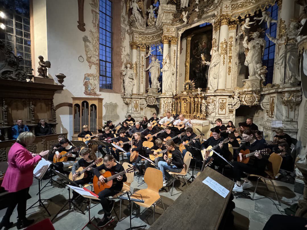 Volkach – Die Gitarren-Serenade der Musikschule Volkacher Mainschleife fand ein großes Echo: Die Kartause Astheim war voll besetzt und das Publikum spendete begeisterten, stehenden Applaus, die Musiker/innen revanchierten sich mit einer Zugabe.