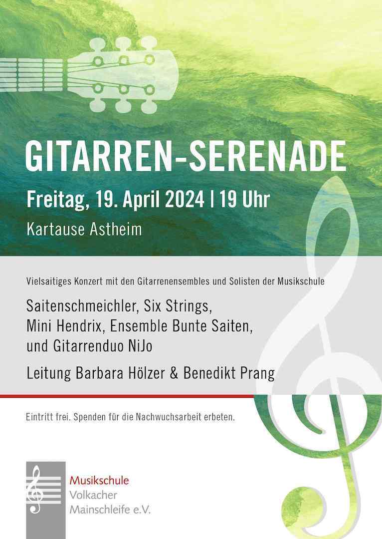 In der Gitarren-Serenade spielen Ensembles und Solisten der Musikschule unter der Leitung von Barbara Hölzer und Benedikt Prang. Der Eintritt ist frei, es wird um Spenden für die Nachwuchsarbeit gebeten.