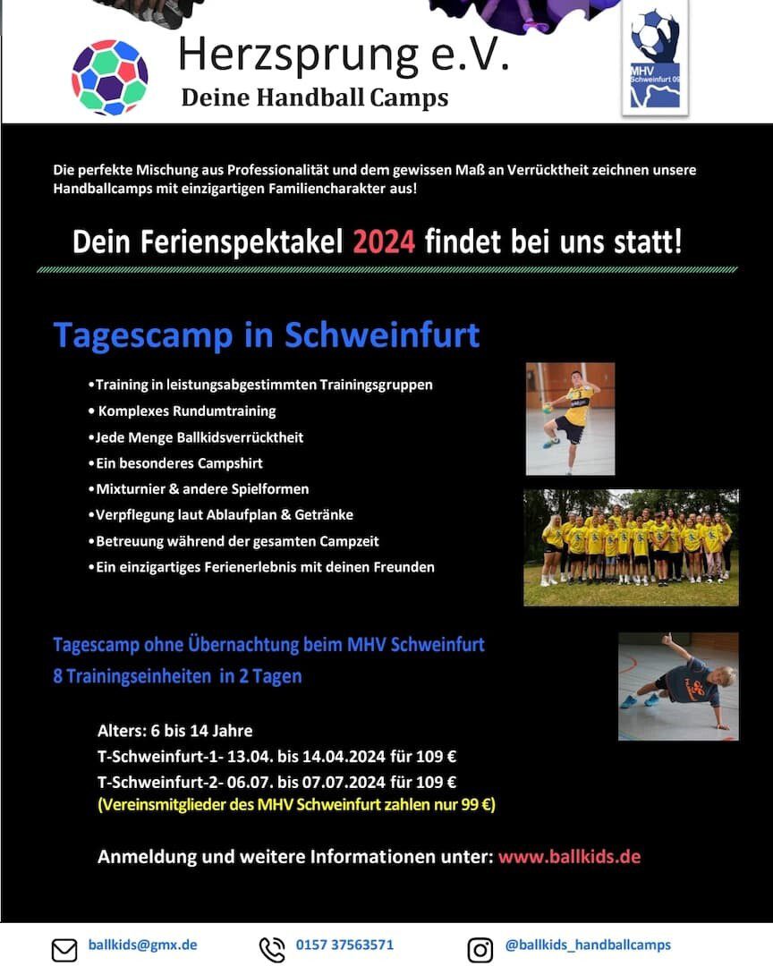 Sport/Handball – Der MHV Schweinfurt 09 ist in diesem Jahr erstmals Kooperationspartner des Vereins Ballkids e.V./Herzsprung e.V., welche deutschlandweit Handballcamps für Kinder und Jugendliche anbieten. Diese Camps gehen jetzt bereits in die 22. Saison. An zwei Wochenenden wird es bei uns in Schweinfurt ein zweitägiges Handballcamp, ohne Übernachtung, geben. Das erste Camp im April war bereits ein großer Erfolg, nun folgt das zweite Camp. Dafür sind noch Plätze frei.