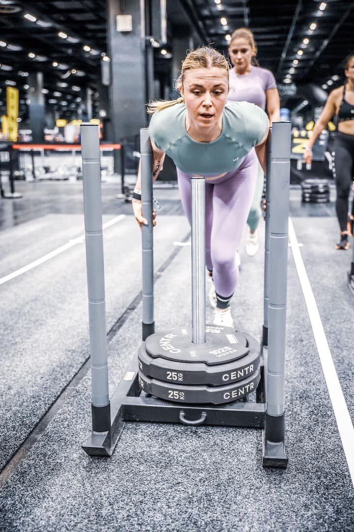 Die acht Stationen heißen Ski-Ergometer, Sled Push (Schlitten schieben), Sled Pull (Schlitten ziehen),