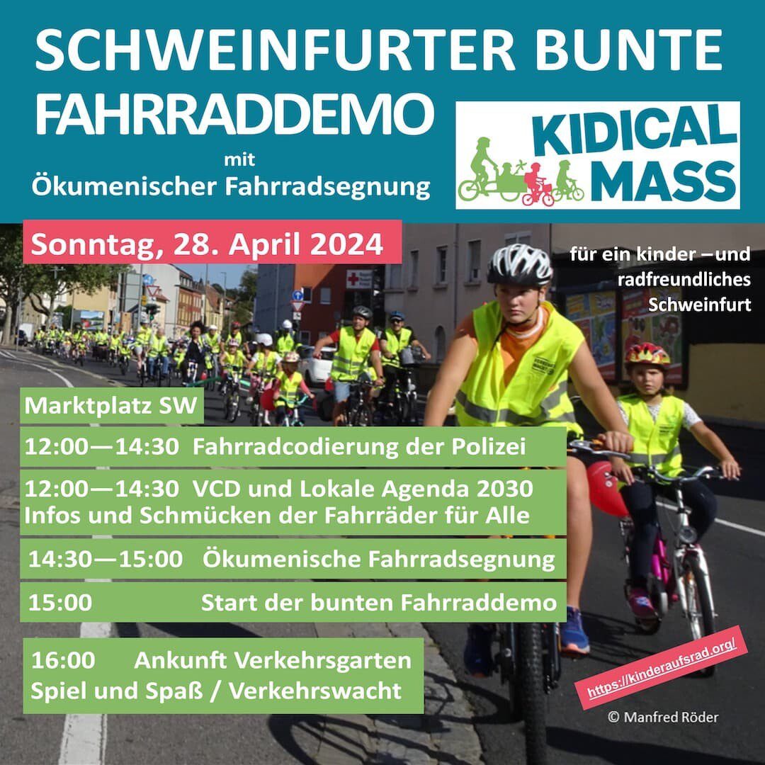 Schweinfurt – Am Sonntag, 28. April wird der Marktplatz in Schweinfurt zum siebten Mal Schauplatz der Kidical Mass. Die bunte und kinderfreundliche Fahrrad-Demo findet zweimal im Jahr in vielen Städten in Deutschland und weltweit statt und setzt sich für eine bessere, kinder- und jugendfreundliche Mobilität ein.