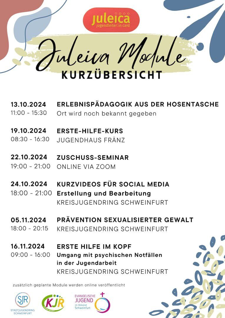Schweinfurt – Der Stadtjugendring Schweinfurt und die Evangelische Jugend Schweinfurt haben für den Herbst 2024 eine Reihe spannender Seminare zusammengestellt, die euch bei der Verlängerung eurer Jugendleiter:innen-Card (Juleica) unterstützen können. Mit Ausnahme des Erste-Hilfe-Kurses werden alle Veranstaltungen für die Juleica-Verlängerung anerkannt. Insgesamt benötigt ihr dafür acht Zeitstunden à 60 Minuten.