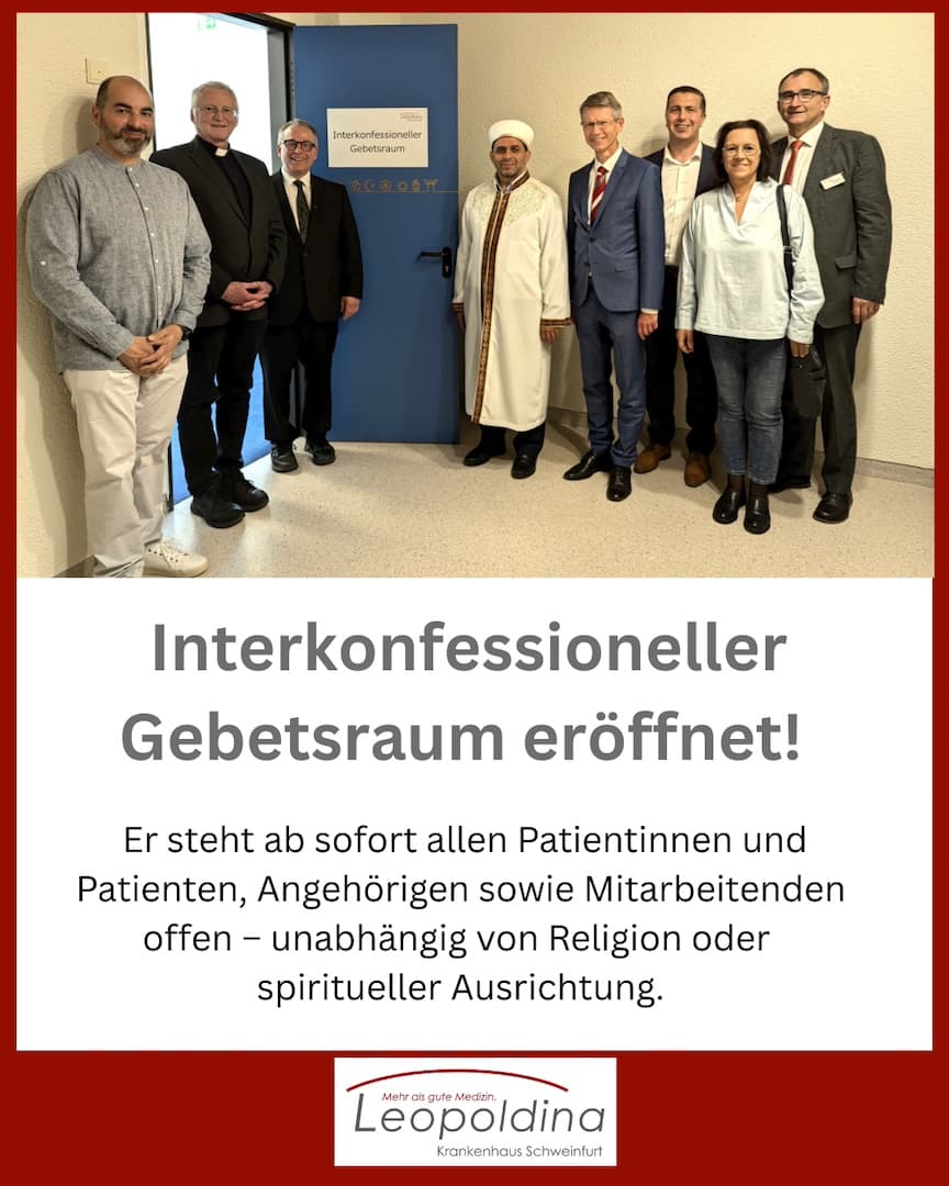 Schweinfurt – Gemeinsam mit Vertretern der Geistlichkeit und des Integrationsbeirates wurde der „Raum der Stille“ im 8. Obergeschoss von Oberbürgermeister Sebastian Remelé und Leopoldina-Geschäftsführer Jürgen Winter seiner Nutzung übergeben. Er steht ab sofort allen Patientinnen und Patienten, Angehörigen sowie Mitarbeitenden offen – unabhängig von Religion oder spiritueller Ausrichtung.