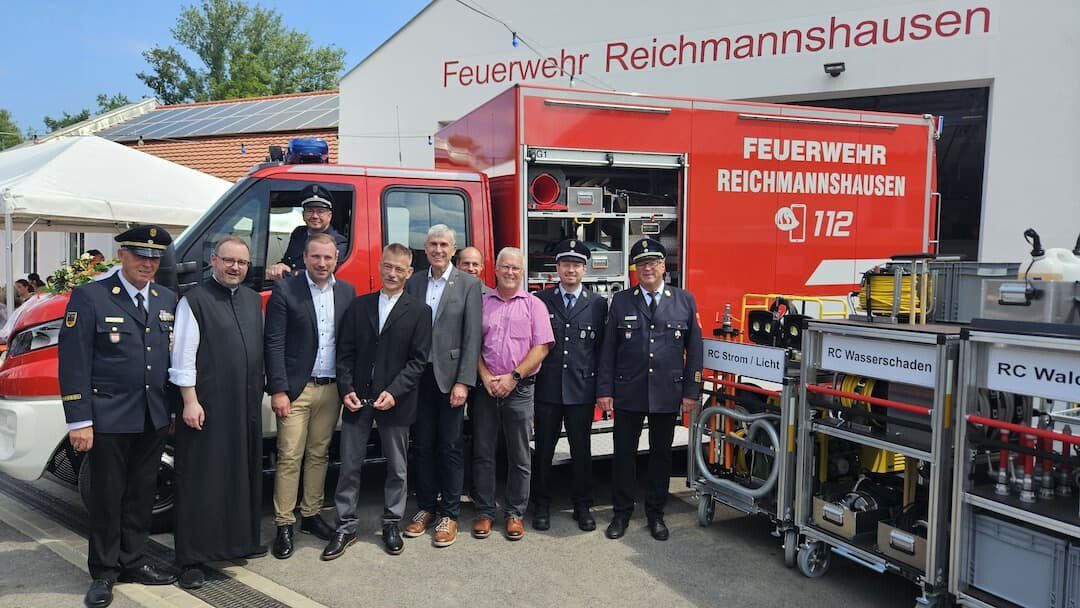 Schonungen – Die Einweihungen, Eröffnungen und Übergaben reißen nicht ab: Vergangenes Wochenende konnte Bürgermeister Stefan Rottmann das neue TSF-Logistik an die freiwillige Feuerwehr in Reichmannshausen feierlich übergeben. Die ökumenische Segnung übernahmen Pfarrer Kai Söder und Andreas Duft. Knapp 20 Einsatzfahrzeuge unterhält Schonungen in allen Ortsteilen. Der Fuhr- und Maschinenpark wurde in den letzten Jahren konsequent erneuert und auch wie hier in Reichmannshausen neue Feuerwehrhäuser errichtet.