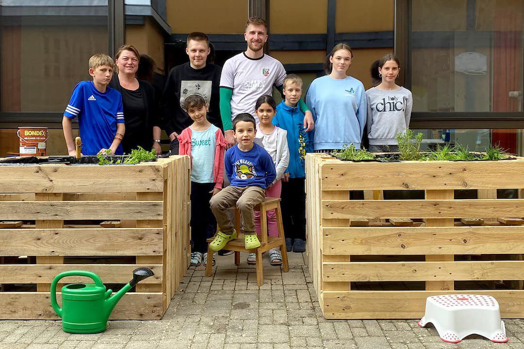 Nachwuchskräfte von Kräuter Mix bauen dem Kinderheim in Geesdorf zwei Kräuterhochbeete
