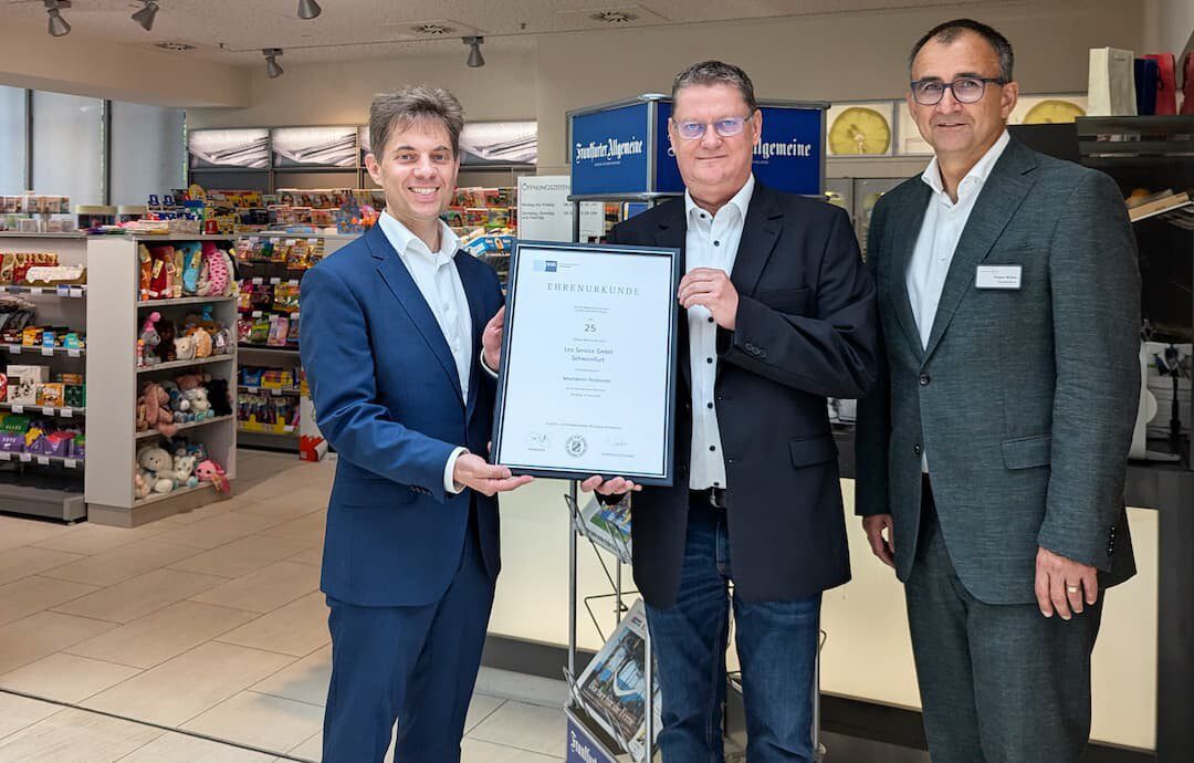 Zum Jubiläum gratulierte Simon Suffa, Büroleiter der IHK Schweinfurt und überreichte Jürgen Winter (Geschäftsführer Leo Service und Leopoldina-Krankenhaus) und Volker Röder (Geschäftsführer Leo Service) die Urkunde über die 25-jährige Mitgliedschaft.