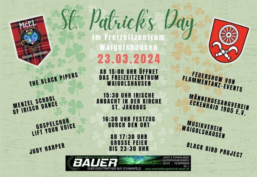 Weigoldshausen – Es ist wieder soweit – der Clan McEL lädt herzlich ein, gemeinsam den St. Patrick’s Day 2024 in einer Atmosphäre aus Gelächter, Musik und natürlich einer Menge grünem Spaß zu feiern! Dieses Jahr wird es ein ganz besonderer Anlass sein, denn es wird der erste große St. Patrick’s Day seit 2018 sein, der aufgrund der Corona-Jahre besonders mit Vorfreude erwartet wird. Die Einnahmen des Festes gehen an das Brückenteam der Palliativstation St. Josef Schweinfurt.