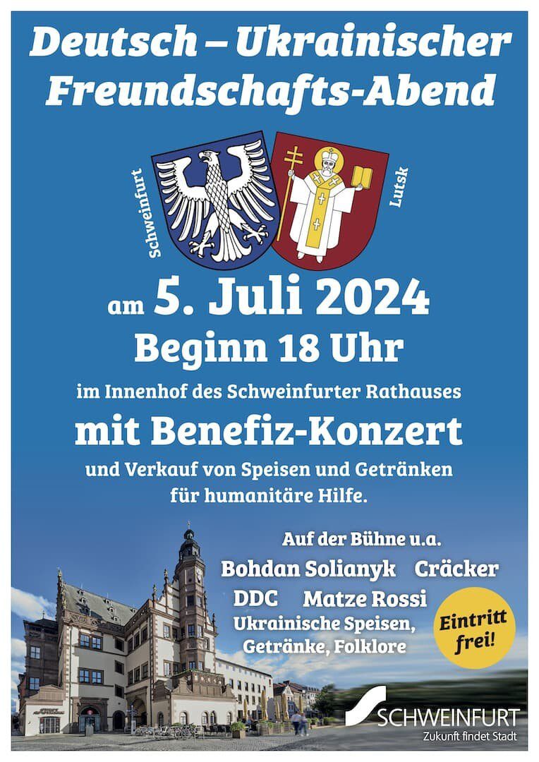 Schweinfurt – Die Stadt Schweinfurt lädt am Freitag, 05. Juli alle Bürger zu einem deutsch-ukrainischen Freundschaftsabend in den Innenhof des Rathauses ein.