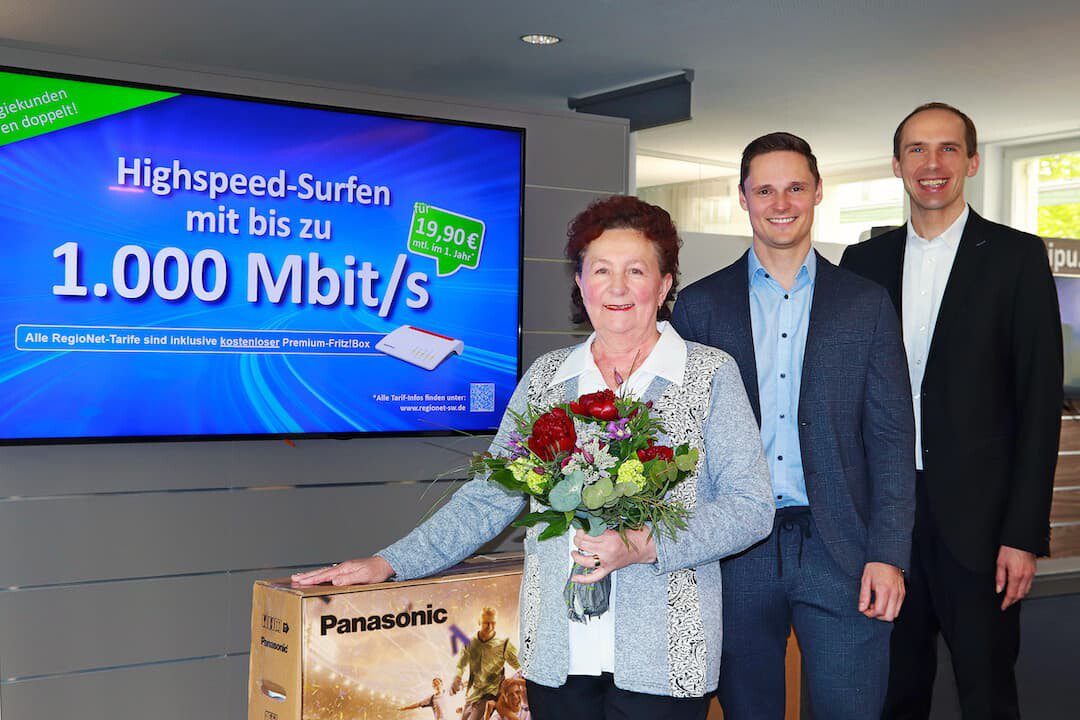 Schweinfurt – Andreas Göb, Prokurist, und Tobias Volk, Projektleiter Glasfaserausbau, von den Stadtwerken Schweinfurt übergaben der glücklichen Gewinnerin Frau Nadeschda Dudko einen hochwertigen und fabrikneuen 4K LED SMART-Fernseher. Dieser war im Rahmen des RegioNet-Gewinnspiels als Hauptpreis ausgelobt. Frau Dudko hatte im Gewinnspielzeitraum einen Internet-Neuvertrag bei der RegioNet abgeschlossen und so an der Verlosung teilgenommen.