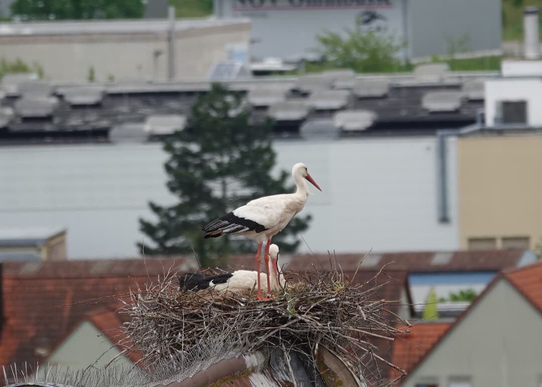 Der Begriff „wie Bonnie und Clyde“ sei sprichwörtlich geworden für Unzertrennlichkeit angesichts widriger Umstände, für Liebe und Zusammenhalt selbst bis in den Tod. Auch das passt zu einem Storchenpaar, betont der Erste Bürgermeister, der allen Teilnehmenden für die vielen schönen und originellen Namensvorschläge dankte. „Dieser Vorschlag sammelte mit weitem Abstand die meisten Stimmen in der Umfrage ein und also werden unsere Störche auf den Namen Bonnie & Clyde ‚getauft‘.“ Frau Nicola darf sich zudem über ein Weinpräsent vom „Zum Storchen“ freuen.