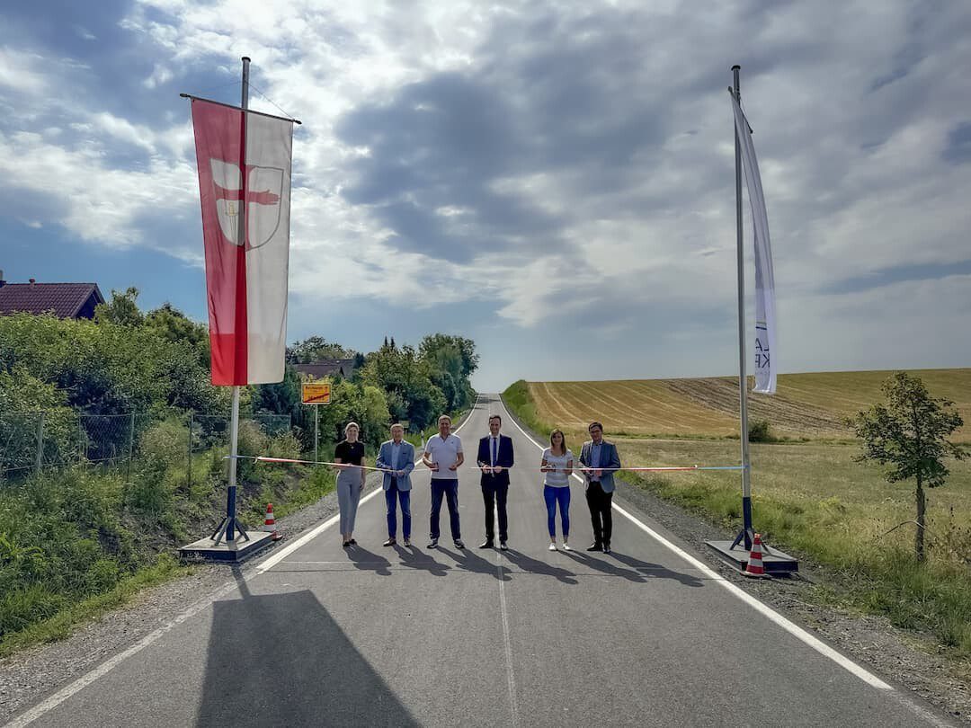 Landkreis Schweinfurt – Mit der symbolischen Freigabe der Kreisstraße SW 55 ging ein weiteres wichtiges Projekt des Tiefbauamts des Landratsamts Schweinfurt erfolgreich zu Ende. Anfang August übergaben Landrat Florian Töpper und sein Tiefbauamtsleiter im Beisein von erstem Bürgermeister Friedel Heckenlauer sowie Verantwortlichen der ausführenden Baufirma, des Straßenverkehrsausschusses und Mitarbeitenden des Landratsamts die Kreisstraße an die Öffentlichkeit. Die Freigabe erfolgte symbolisch, da die Straße bereits direkt nach der Fertigstellung im Juli dieses Jahres für den Verkehr geöffnet worden war.